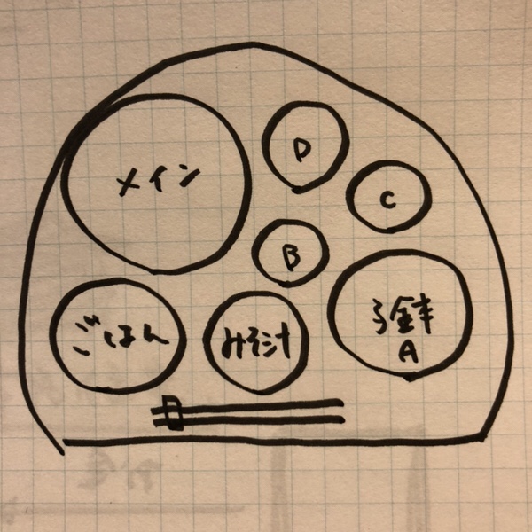 日本:お盆に乗せて配膳すると、枠・領域ができ、自然と一人前という意識が生まれる。潜在的な意識である「もったいない」もあるため、一人前はきちんと残さず(大切に)食べる。特にお盆に乗っている場合、同じ卓上で食べ物の共有はあまりしない。